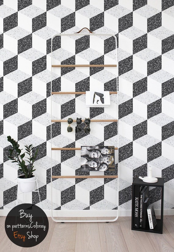 Avoir Geometrique Terrazzo Papier Peint Noir Et Blanc Minimaliste Etsy